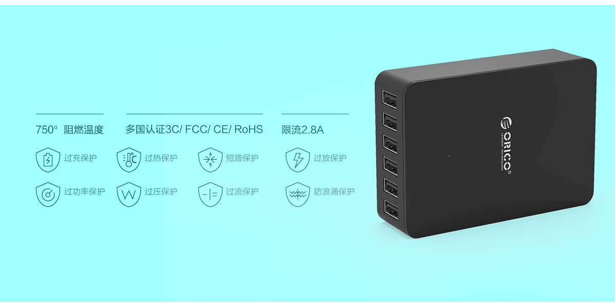 50W大功率輸出以確保六臺設備快速充電,單口可達2.4A充足電流輸出,輕松實現多設備同時充電,要多快就有多快。