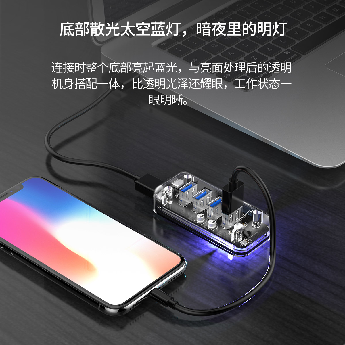 4口USB3.0透明桌面集線器,雙接口供電