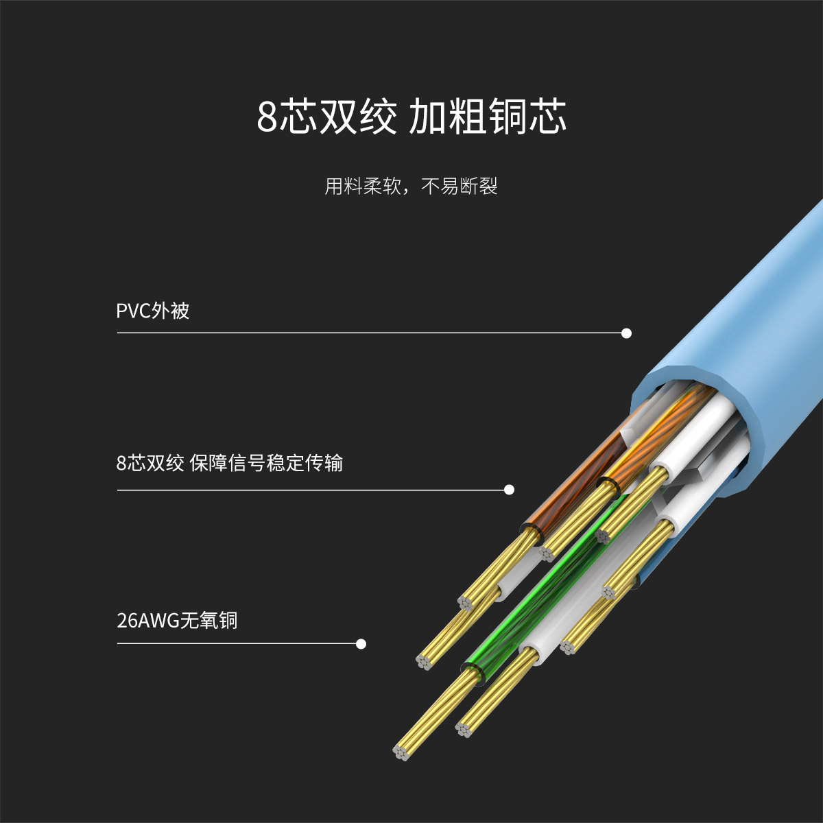 六類(lèi)千兆網(wǎng)線,8芯雙絞,PVC材質(zhì)線被,鍍金水晶頭接口
