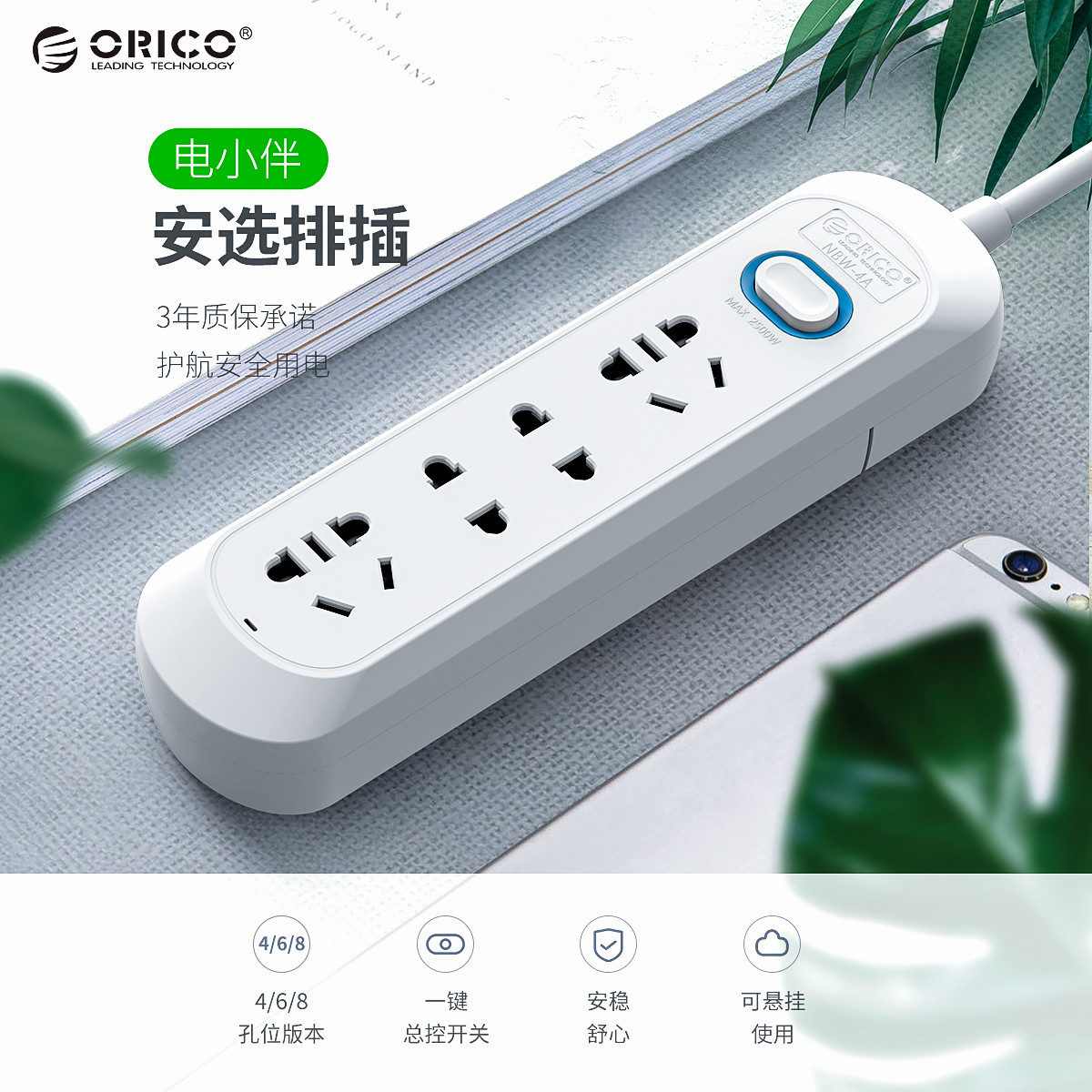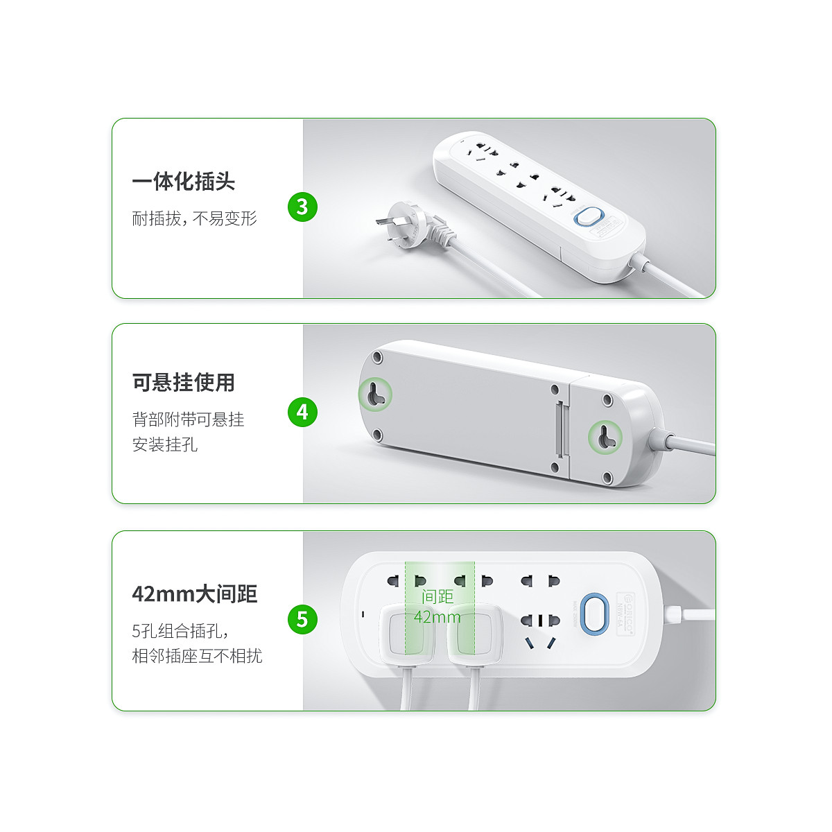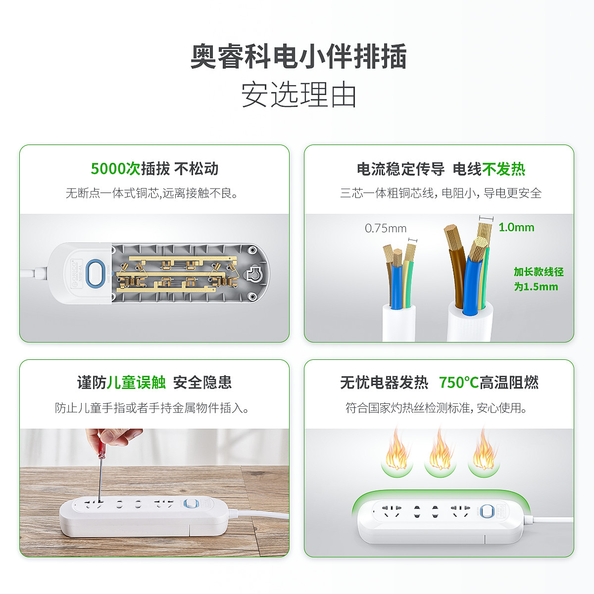 5000次插拔,不松動,電線不發熱,防兒童誤觸,750℃高溫阻燃,多孔位可選,一體化插頭,可懸掛使用,3年質保