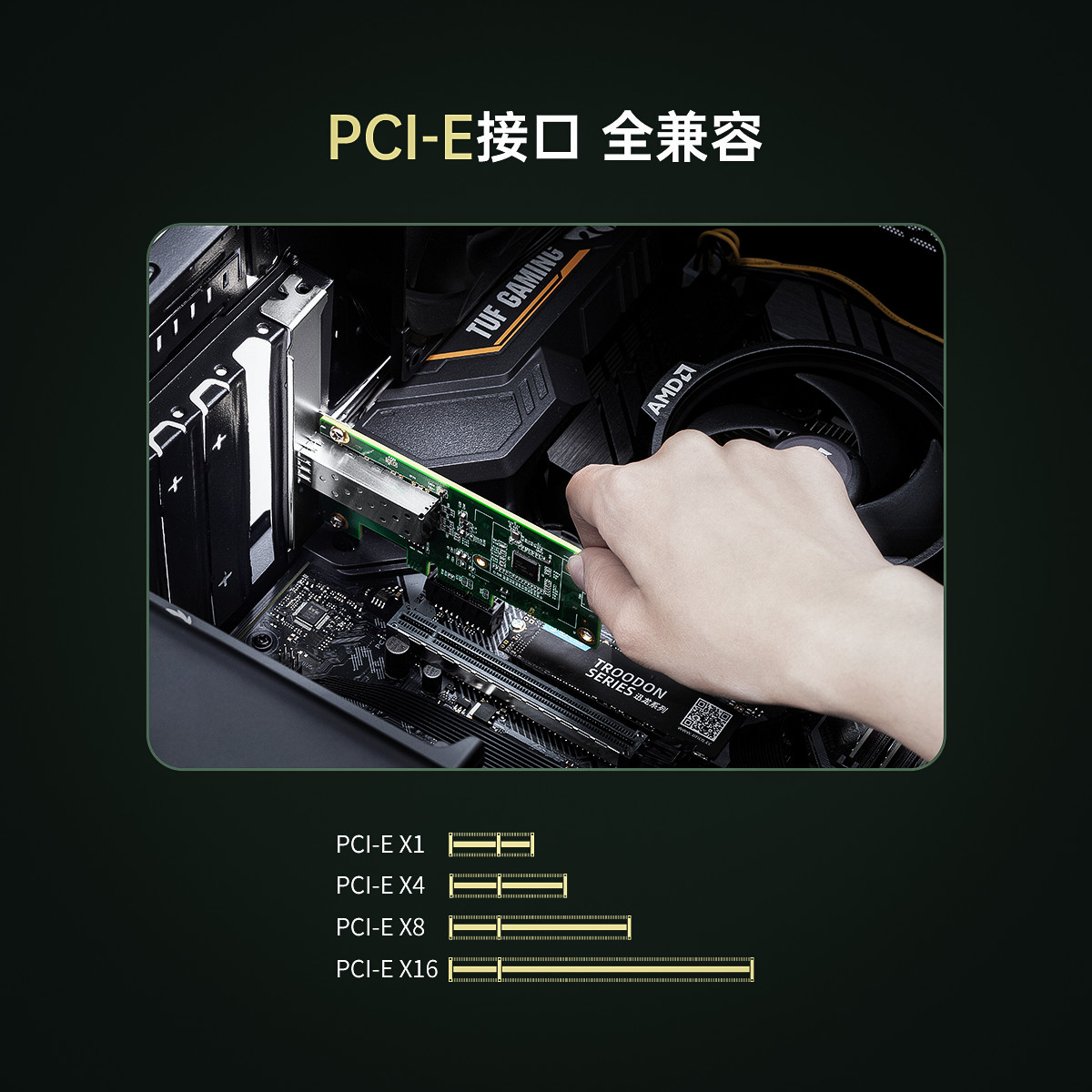 PCl-E插槽│強勁散熱|高速穩定,配備一個標準的SFP光纖口,可插入千兆光纖模塊,采用Intel 1210芯片,更大程度上消除干擾