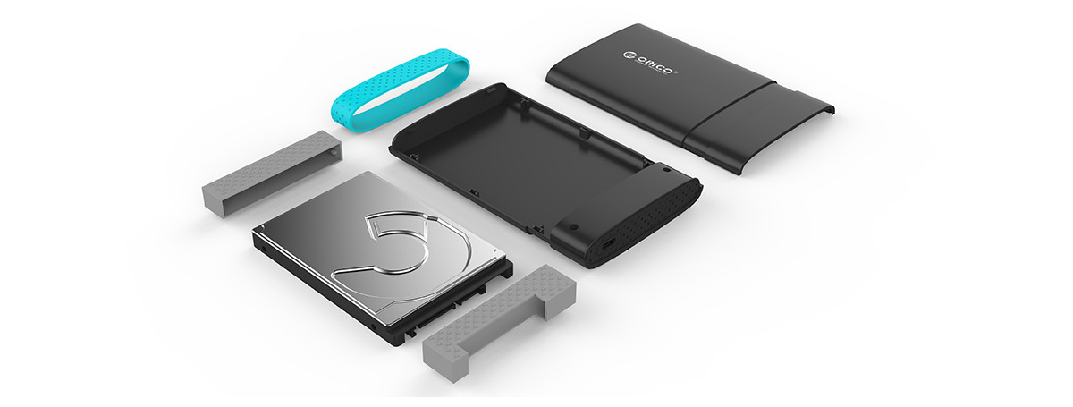 外部采用橡膠圈捆綁方式,牢牢套住硬盤盒,使硬盤跟硬盤盒更穩固,防止硬盤盒滑動或跌落。
