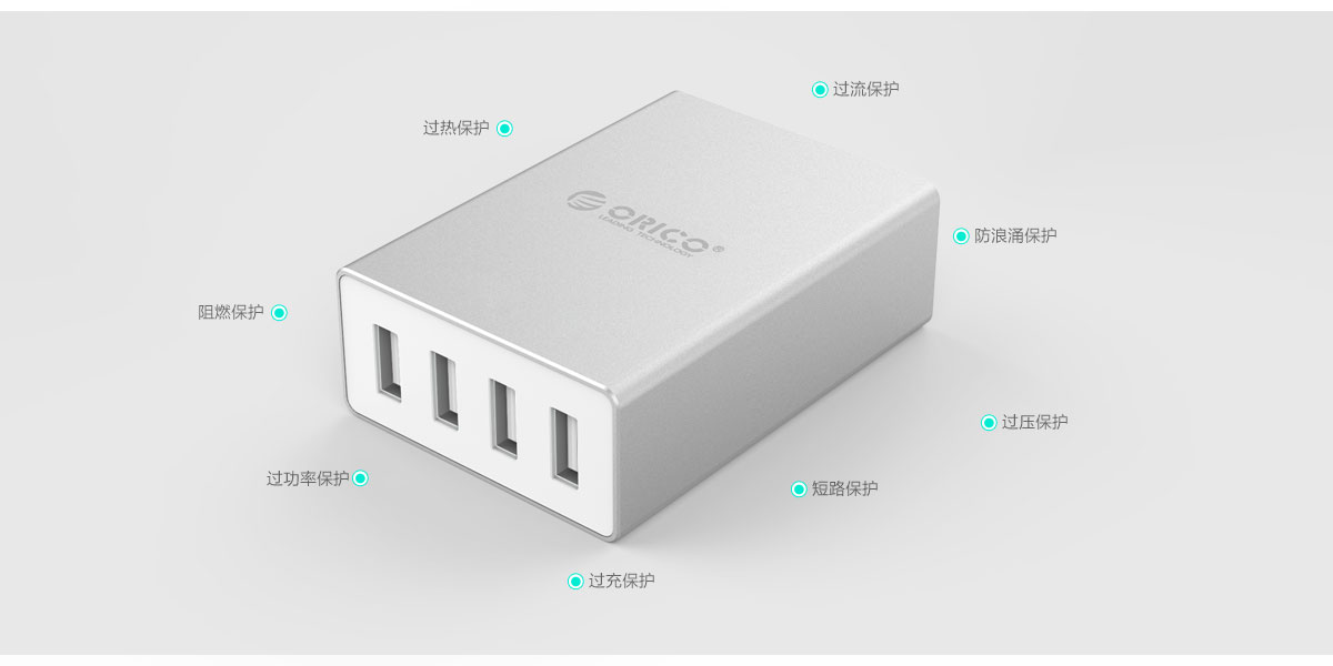 我們采用芯片級別的單口限流功能,用戶在使用充電器時,如果發(fā)生短路等危險情況,USB端口立即停止供電輸出,以保護(hù)USB設(shè)備不會損壞,防止意外事故的發(fā)生。