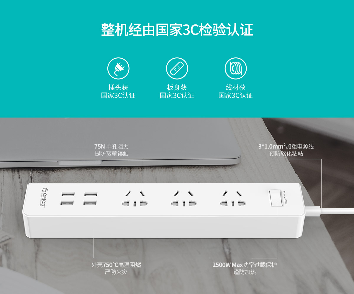 新國標便攜桌面式排插,辦公智能排插,高溫環保材料,底座硅膠防滑