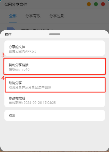 點擊文件右邊的“...”,即可對文件分享鏈接進行復制和取消文件分享。