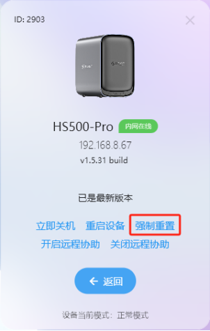 (1)在設(shè)備登錄界面,點(diǎn)擊頭圖進(jìn)到局域網(wǎng)高級(jí)設(shè)置界面,點(diǎn)擊“強(qiáng)制重置”可完成對(duì)設(shè)備的重置操作。